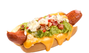 빅 사이즈의 두툼하고 육즙 가득한 약 12인치 할라피뇨 소시지에 다양한 토핑이 어우러진 프리미엄 핫도그