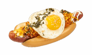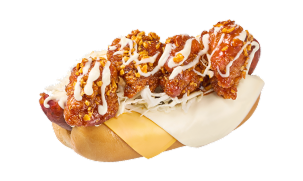 두툼하고 육즙 가득한 약 9인치 소시지에 다양한 토핑이 어우러진 스페셜 핫도그