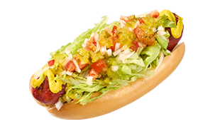풍미 가득한 약 9인치 비프 소시지에 다양한 토핑이 어우러진 클래식 핫도그